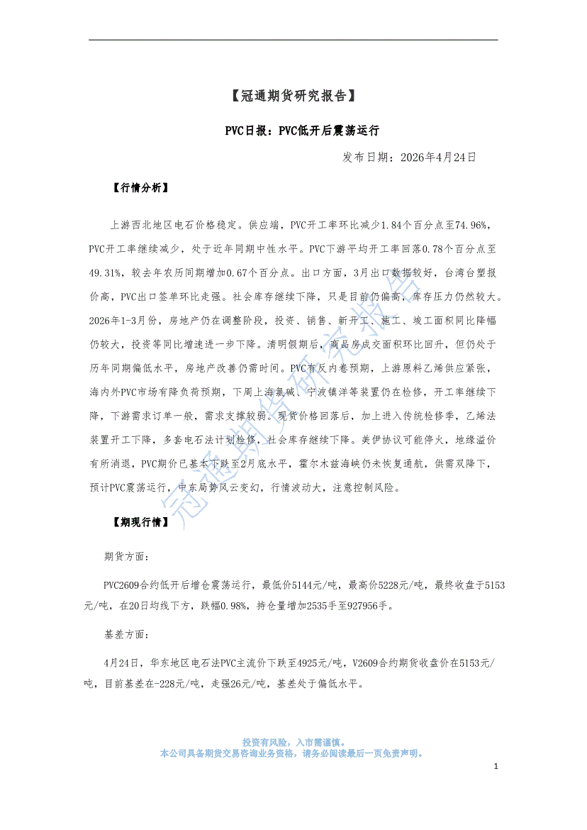 冠通期货-PVC日报:PVC低开后震荡运行-260424
