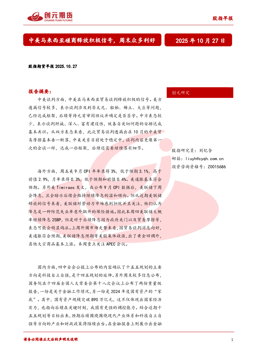 创元期货-股指期货早报:中美马来西亚磋商释放积极信号,周末众多利好-251027