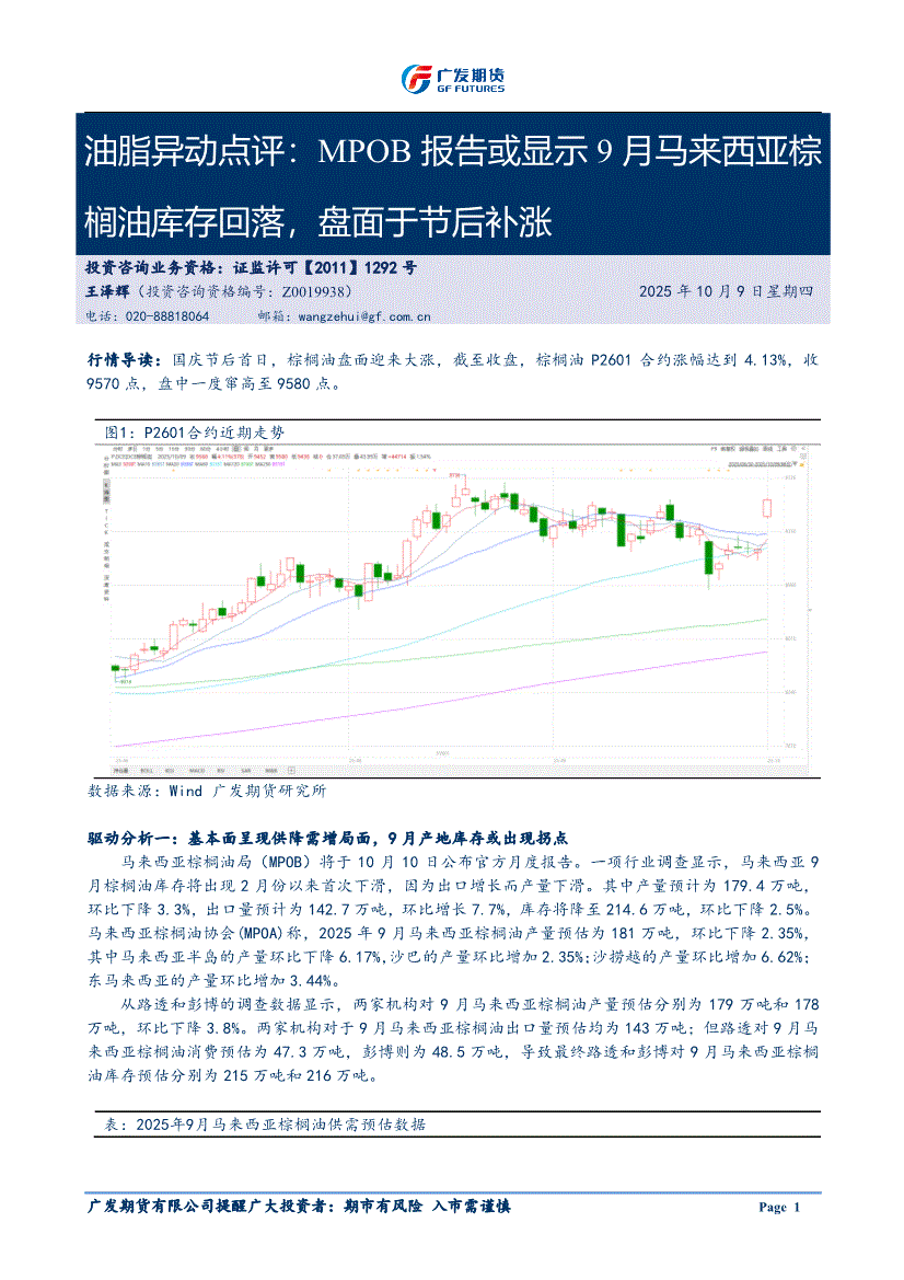 广发期货-油脂异动点评:MPOB报告或显示9月马来西亚棕榈油库存回落,盘面于节后补涨-251009