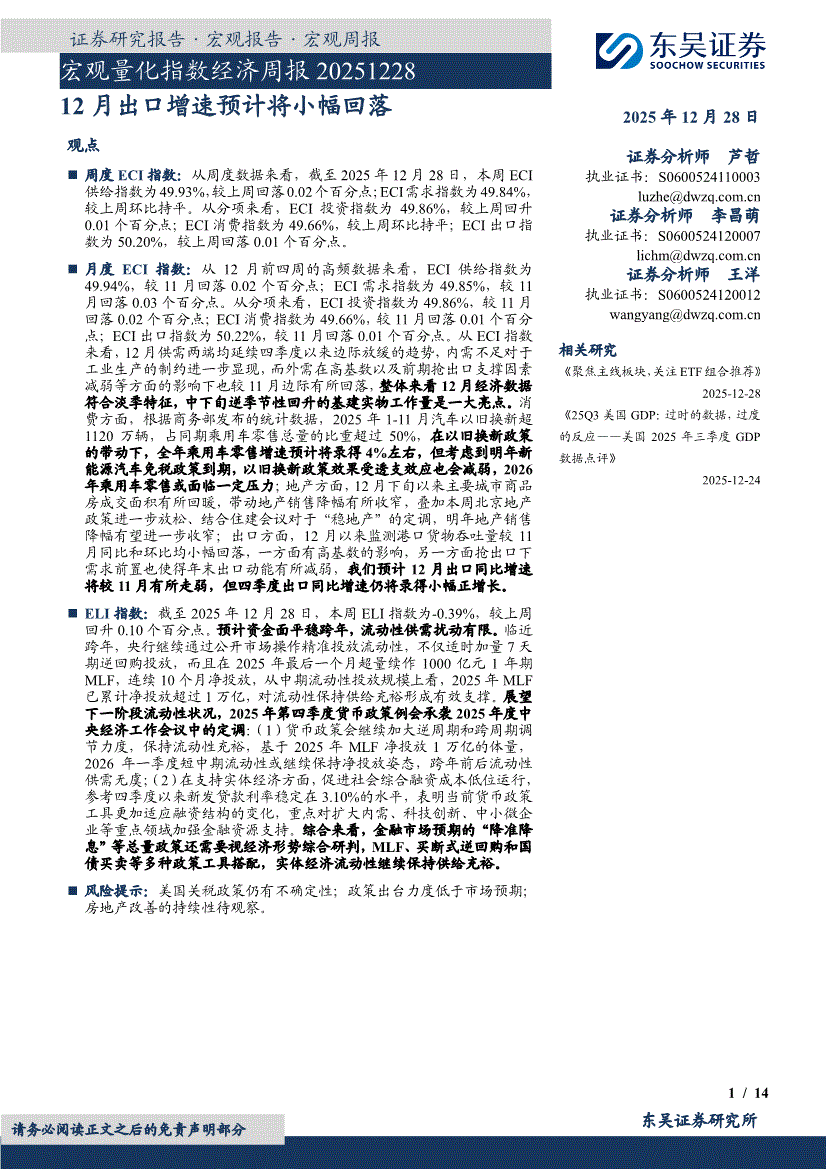 东吴证券-宏观量化指数经济周报:12月出口增速预计将小幅回落-251228