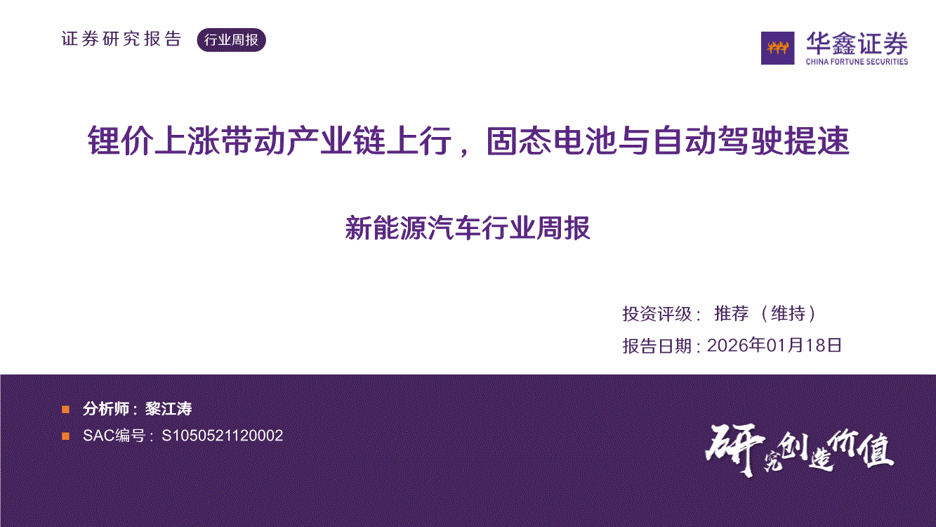 新能源汽车行业:华鑫证券-新能源汽车行业周报:锂价上涨带动产业链上行,固态电池与自动驾驶提速-260118