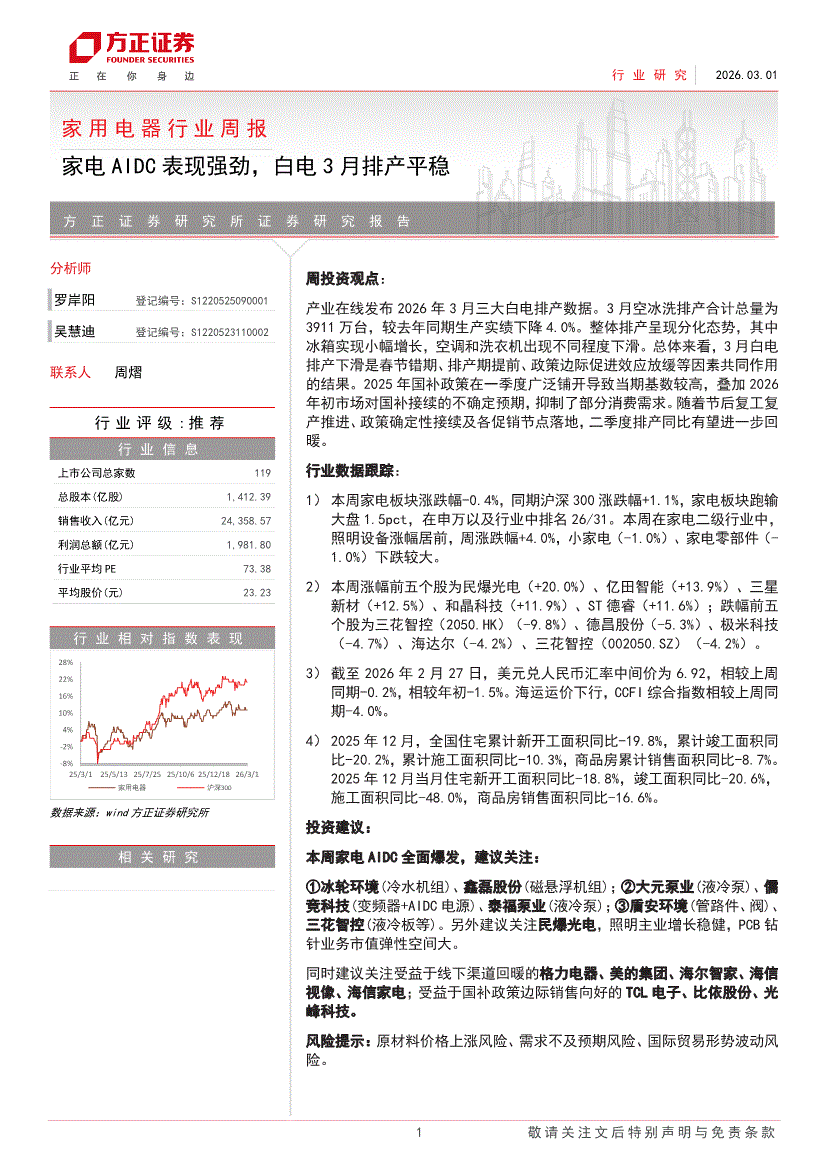 家用电器行业:方正证券-家用电器行业周报:家电AIDC表现强劲,白电3月排产平稳-260301