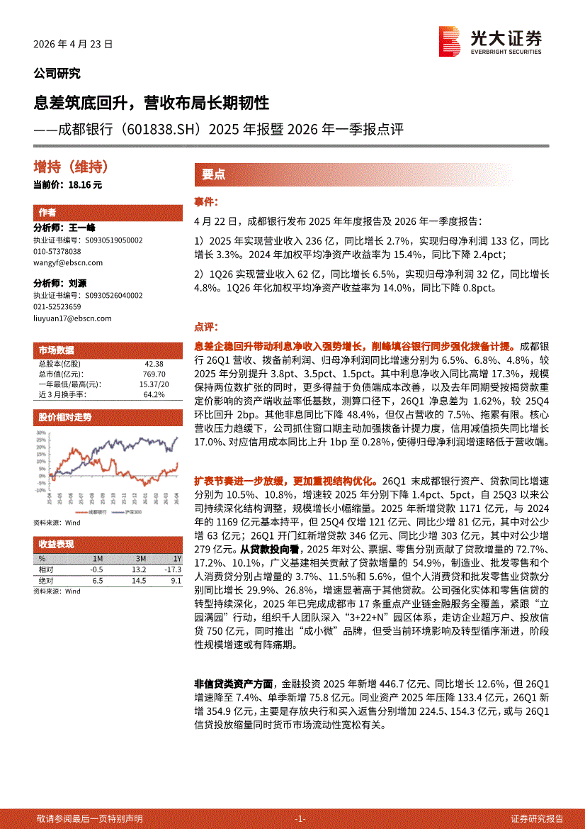 成都银行:光大证券-成都银行-601838-2025年报暨2026年一季报点评:息差筑底回升,营收布局长期韧性-260423