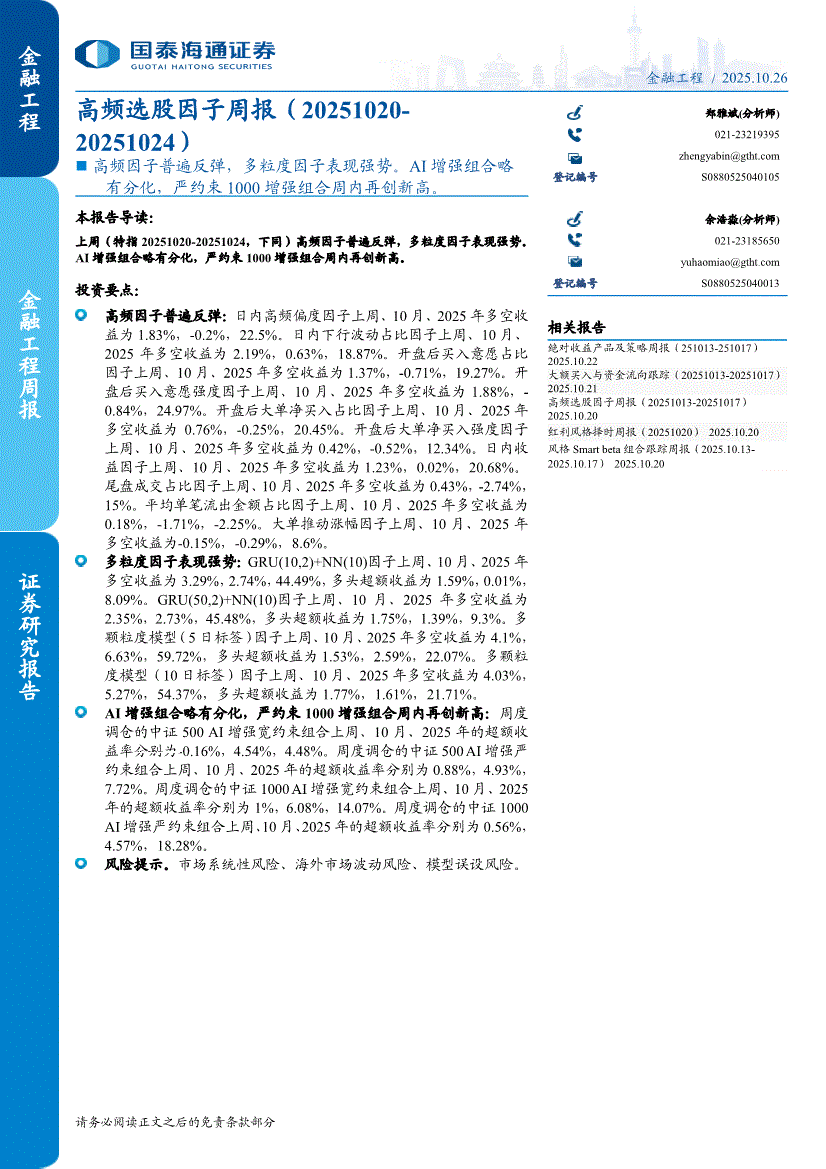 国泰海通证券-高频选股因子周报:高频因子普遍反弹,多粒度因子表现强势。AI增强组合略有分化,严约束1000增强组合周内再创新高-251026