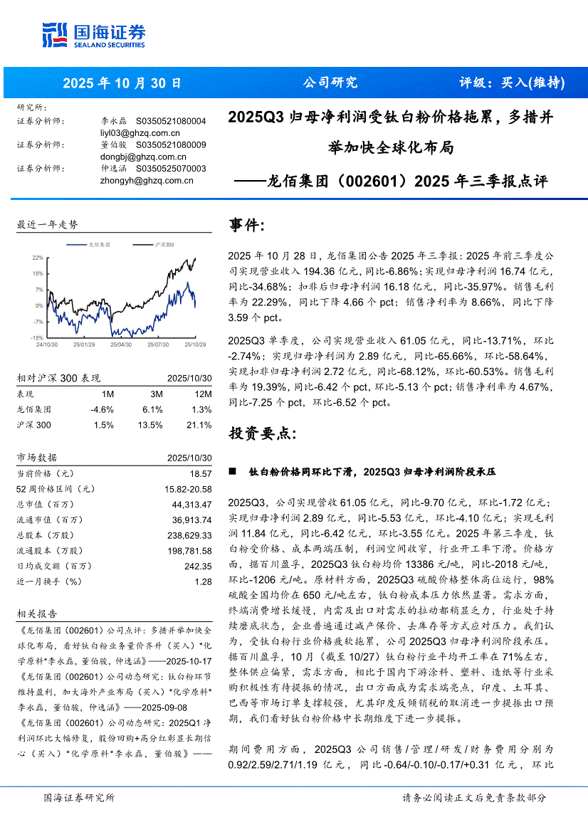 龙佰集团:国海证券-龙佰集团-002601-2025年三季报点评:2025Q3归母净利润受钛白粉价格拖累,多措并举加快全球化布局-251030