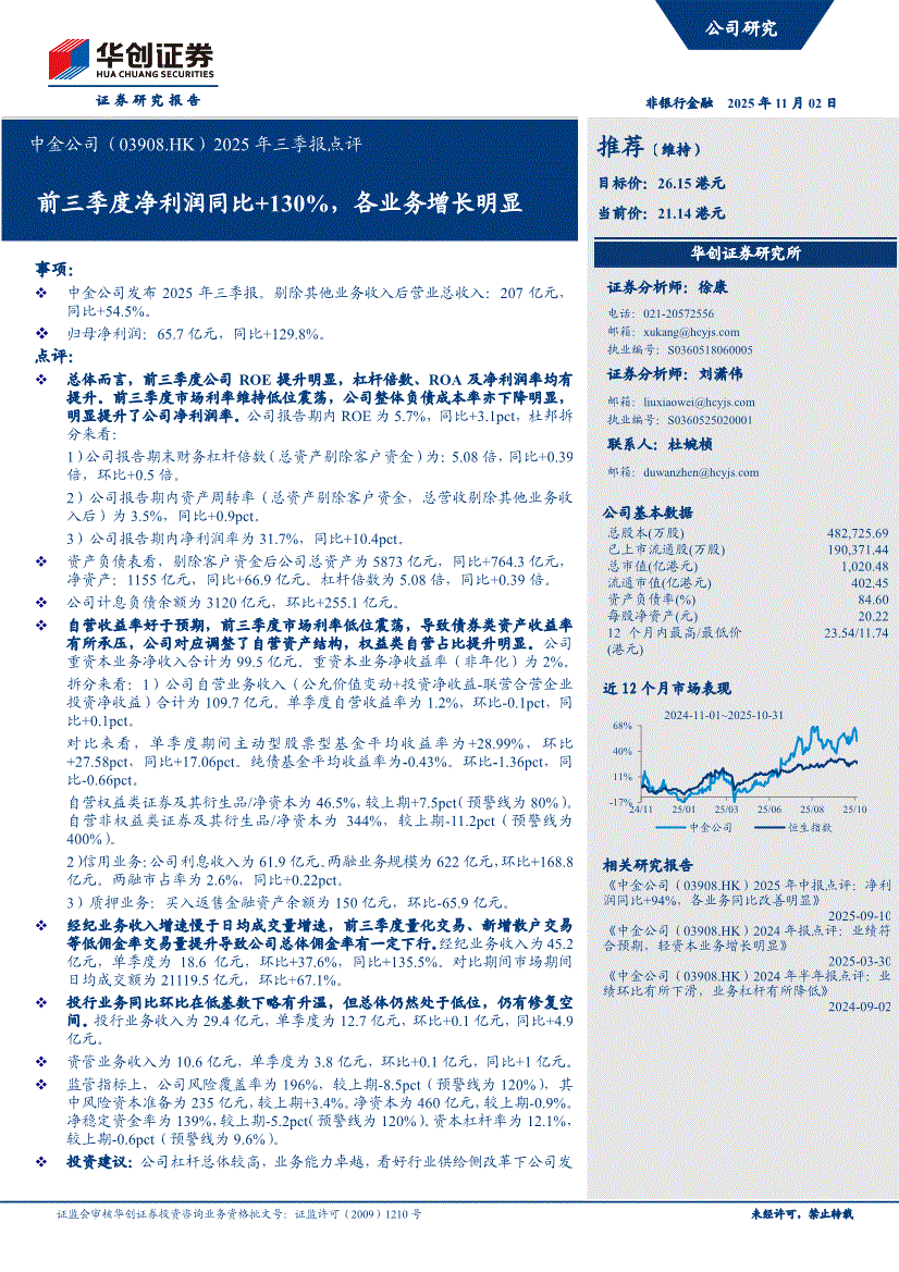 中金公司:华创证券-中金公司-3908.HK-2025年三季报点评:前三季度净利润同比+130%,各业务增长明显-251102