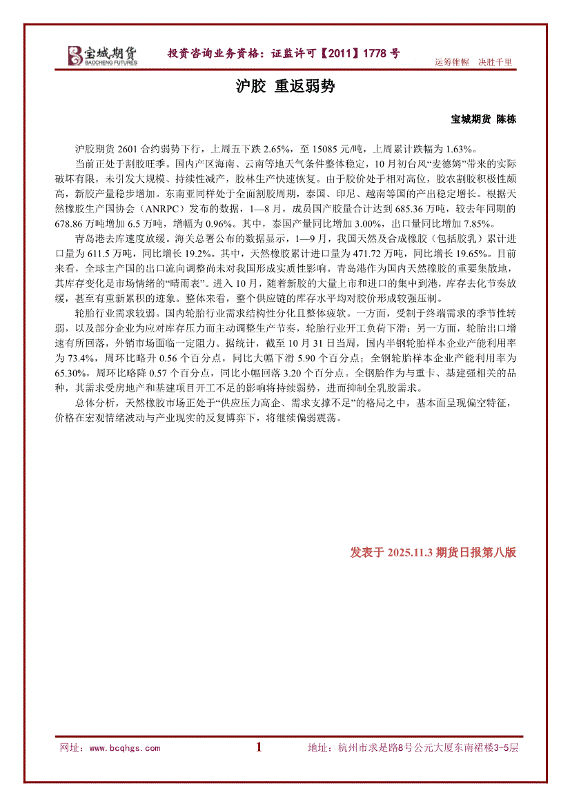 宝城期货-橡胶周报:偏多氛围消化,橡胶震荡偏弱-251103