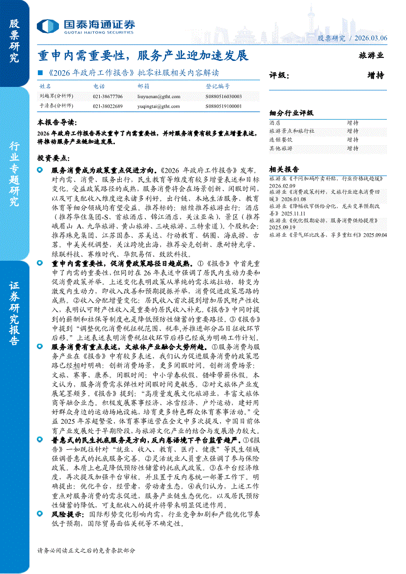 旅游行业:国泰海通证券-旅游行业《2026年政府工作报告》批零社服相关内容解读:重申内需重要性,服务产业迎加速发展-260306