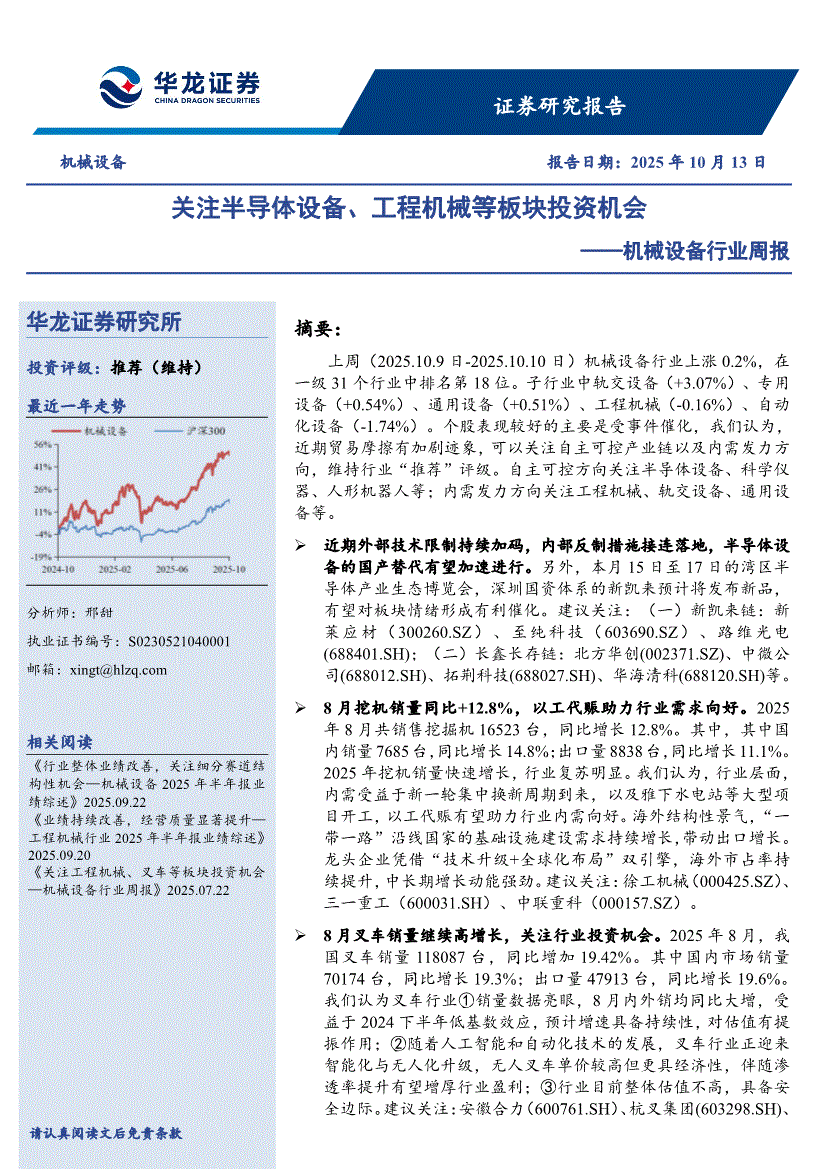机械设备行业:华龙证券-机械设备行业周报:关注半导体设备、工程机械等板块投资机会-251013
