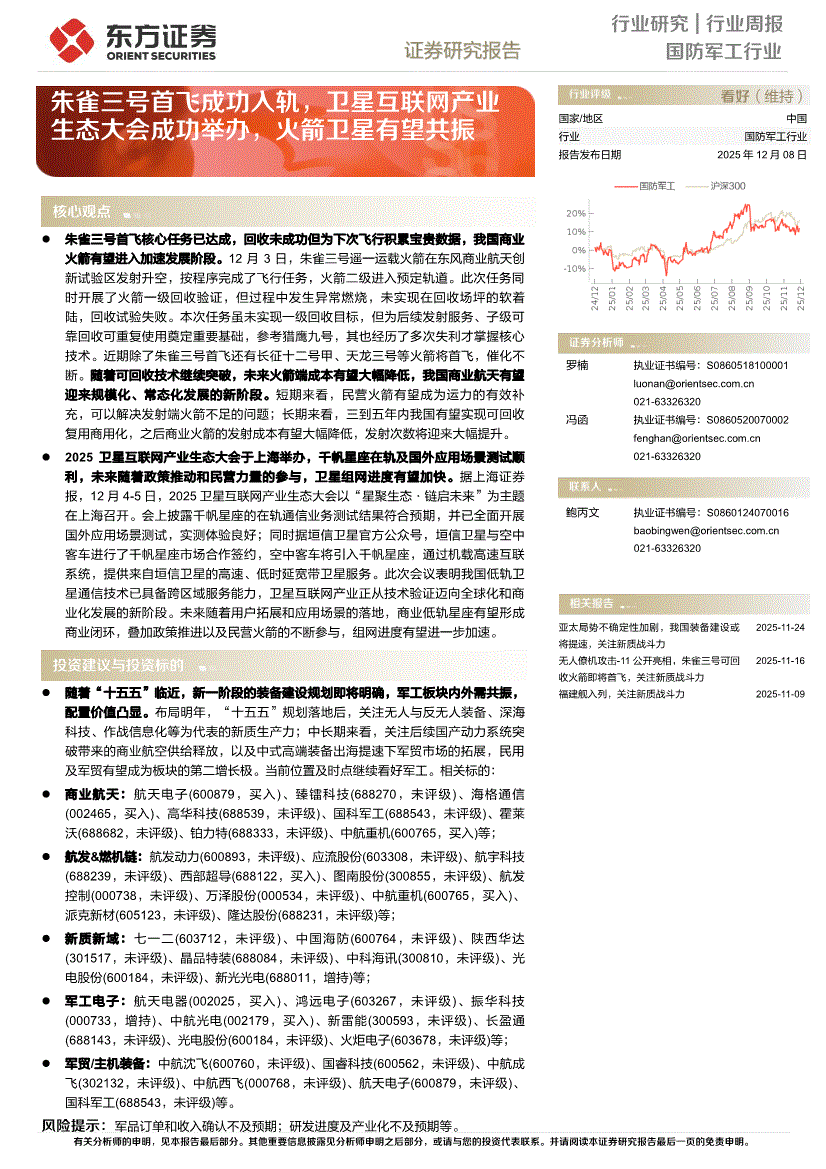 国防军工行业:东方证券-国防军工行业周报:朱雀三号首飞成功入轨,卫星互联网产业生态大会成功举办,火箭卫星有望共振-251208