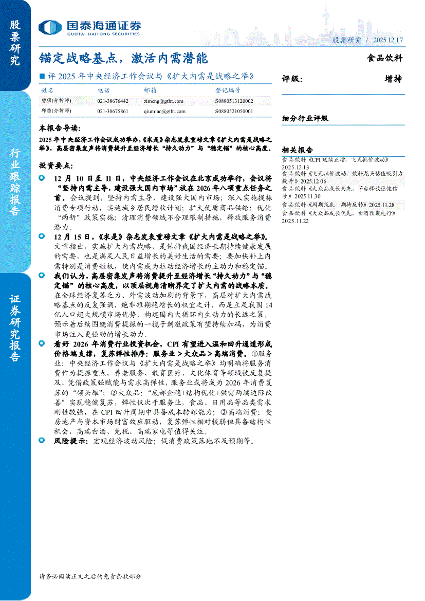 食品饮料行业:国泰海通证券-食品饮料行业评2025年中央经济工作会议与《扩大内需是战略之举》:锚定战略基点,激活内需潜能-251217