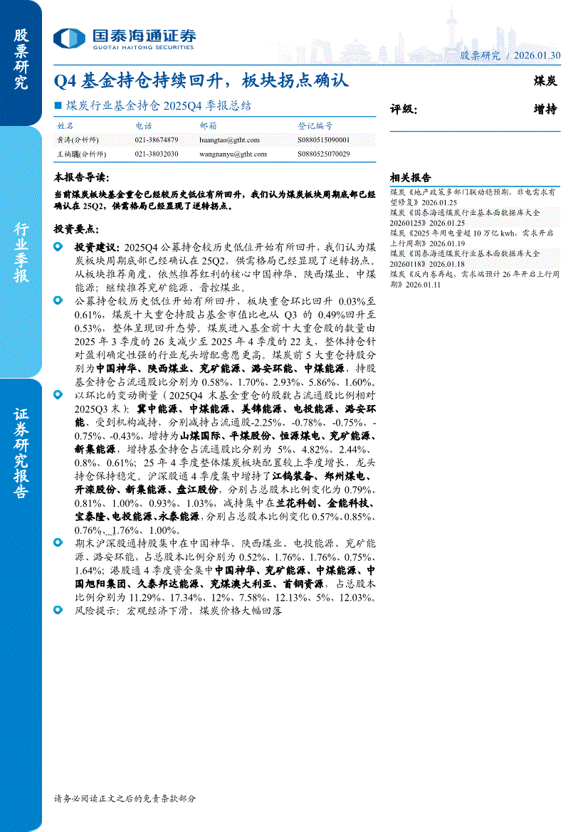煤炭行业:国泰海通证券-煤炭行业基金持仓2025Q4季报总结:Q4基金持仓持续回升,板块拐点确认-260130
