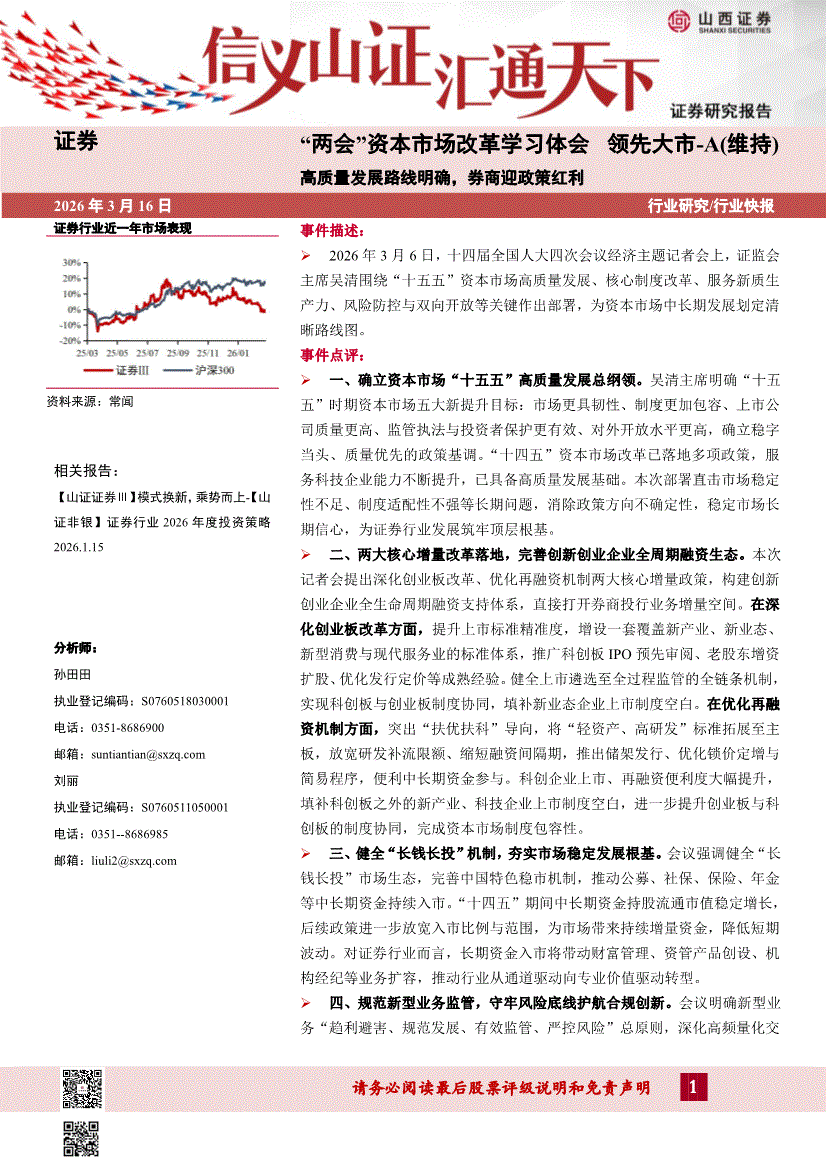 证券行业:山西证券-证券行业“两会”“两会”资本市场改革学习体会:高质量发展路线明确,券商迎政策红利-260316
