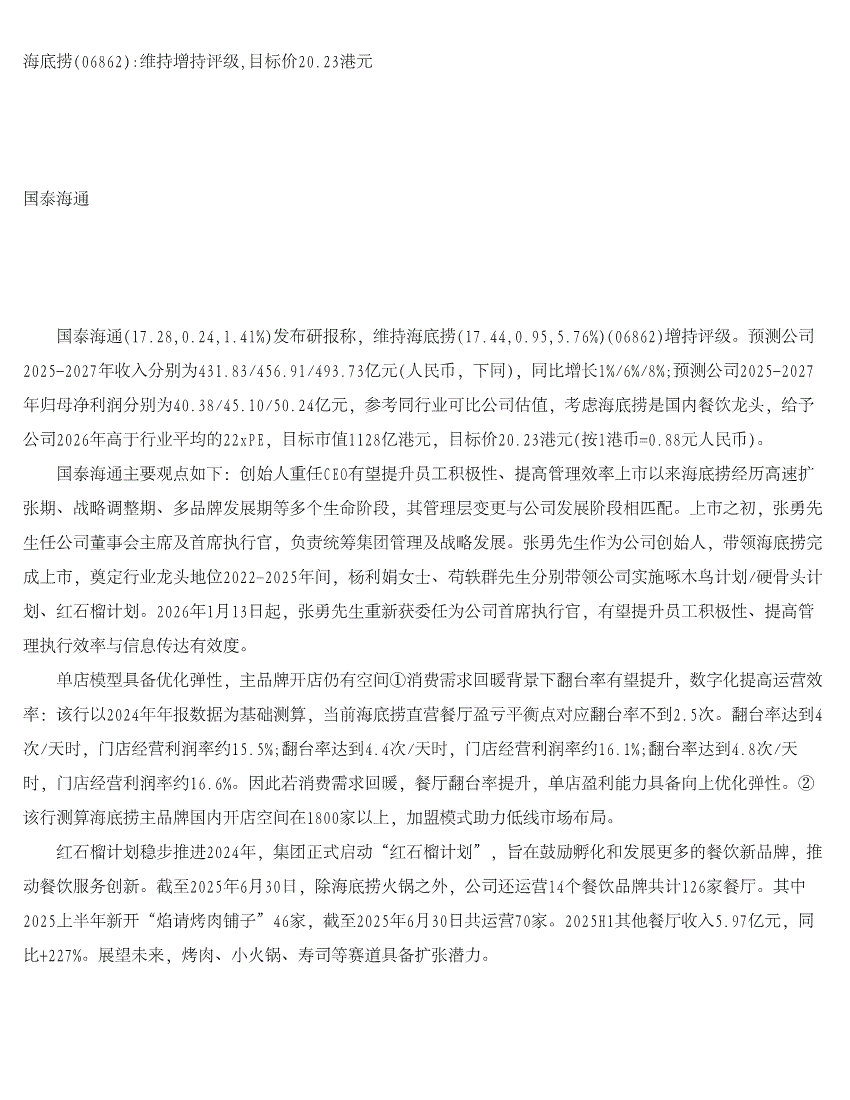 海底捞:国泰海通证券-海底捞-6862.HK-维持增持评级,目标价20.23港元-260224