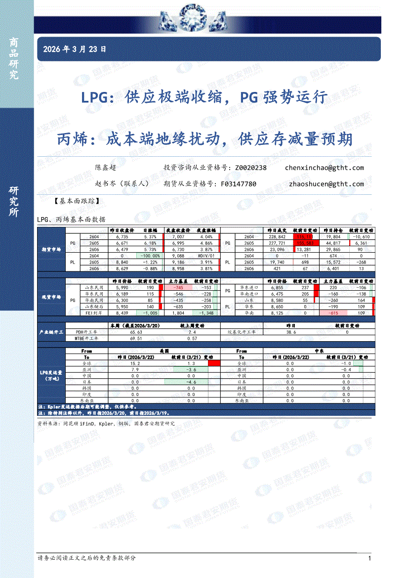 国泰君安期货-LPG:供应极端收缩,PG强势运行,丙烯,成本端地缘扰动,供应存减量预期-260323