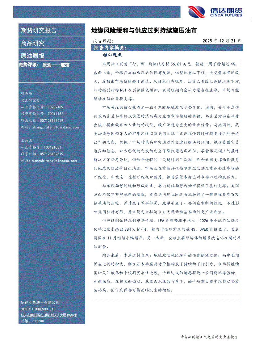 信达期货-原油周报:地缘风险缓和与供应过剩持续施压油市-251221