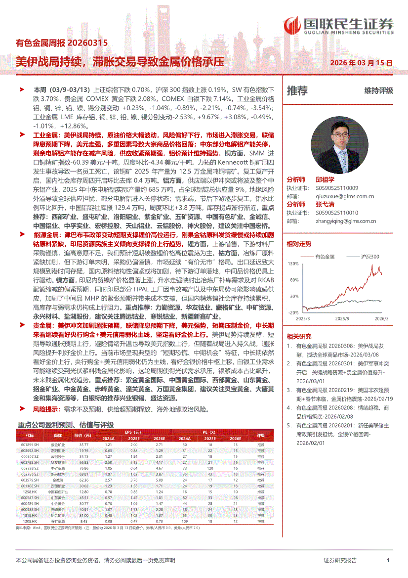 有色金属行业:国联民生证券-有色金属行业周报:美伊战局持续,滞胀交易导致金属价格承压-260315