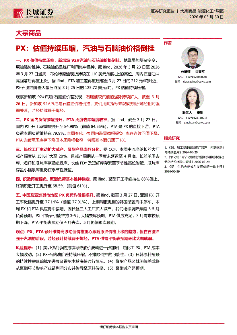 长城证券-大宗商品:PX,估值持续压缩,汽油与石脑油价格倒挂-260330