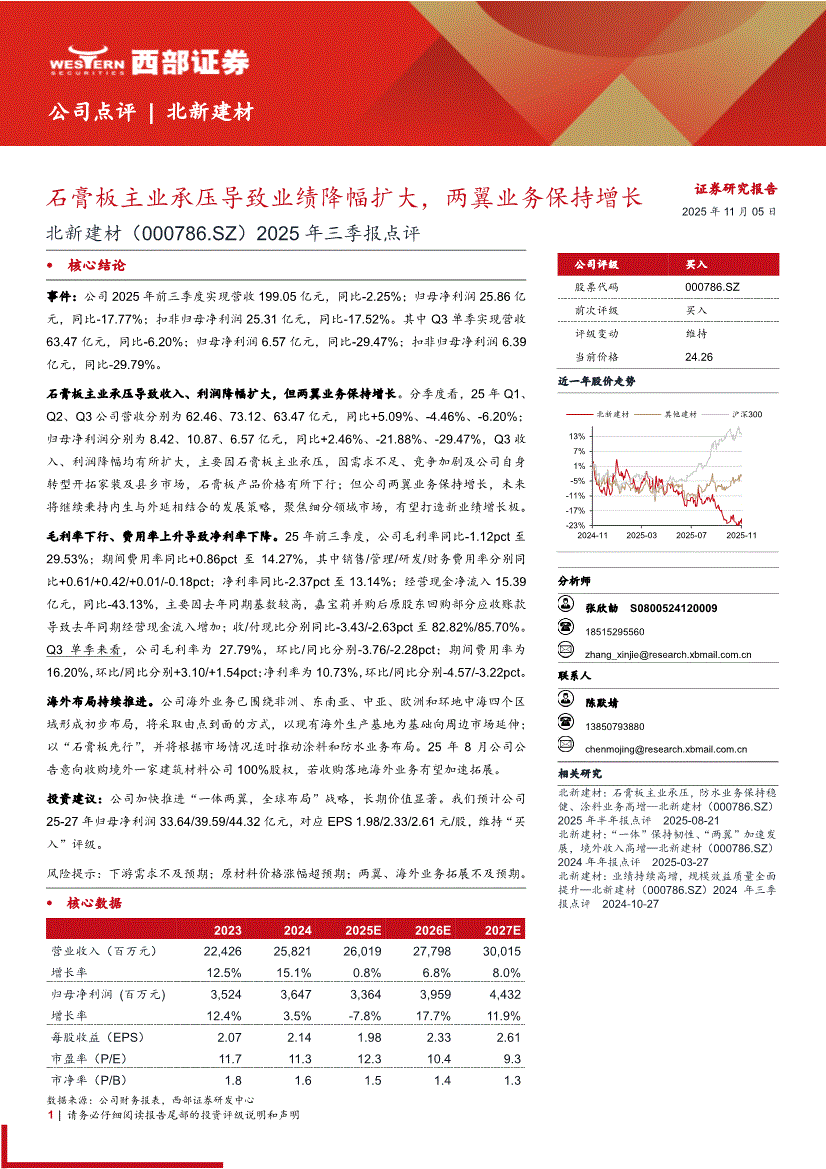 北新建材:西部证券-北新建材-000786-2025年三季报点评:石膏板主业承压导致业绩降幅扩大,两翼业务保持增长-251105