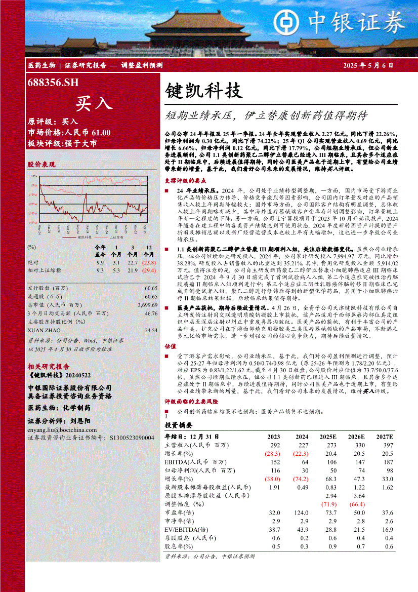键凯科技:中银国际-键凯科技-688356-短期业绩承压,伊立替康创新药值得期待-250506
