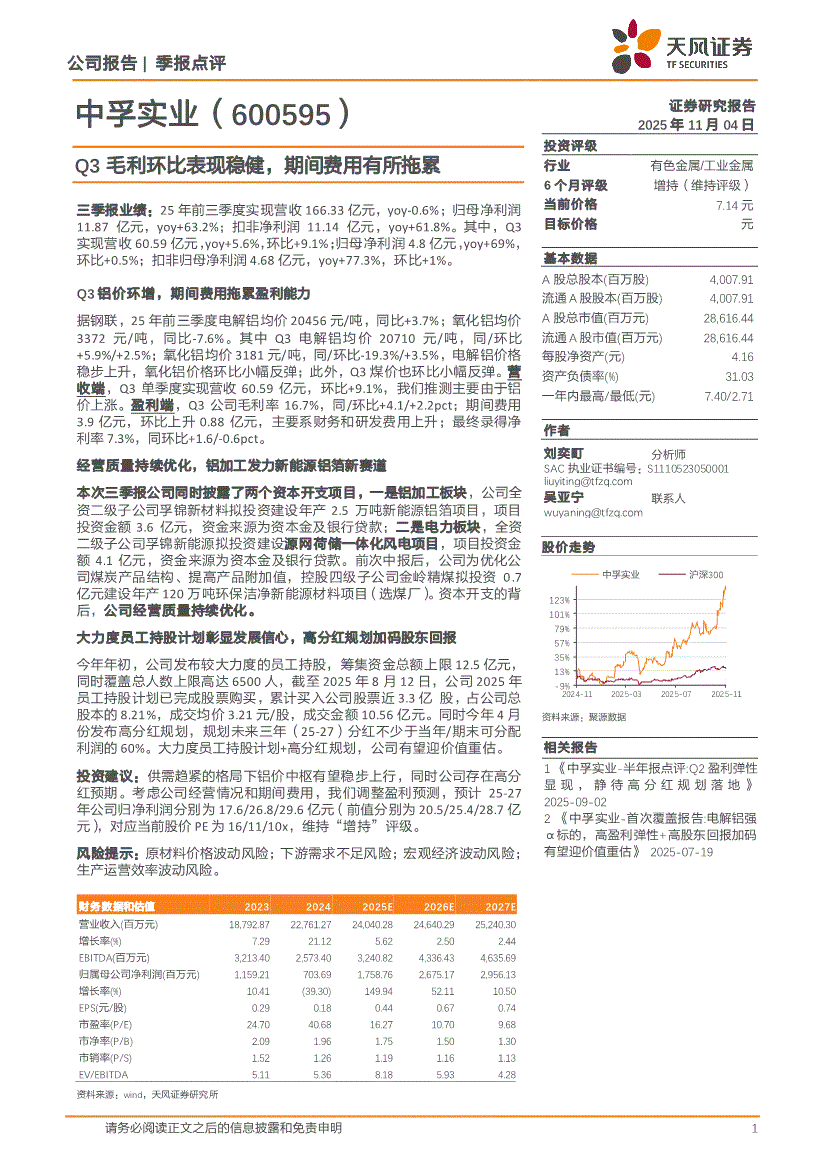 中孚实业:天风证券-中孚实业-600595-Q3毛利环比表现稳健,期间费用有所拖累-251104