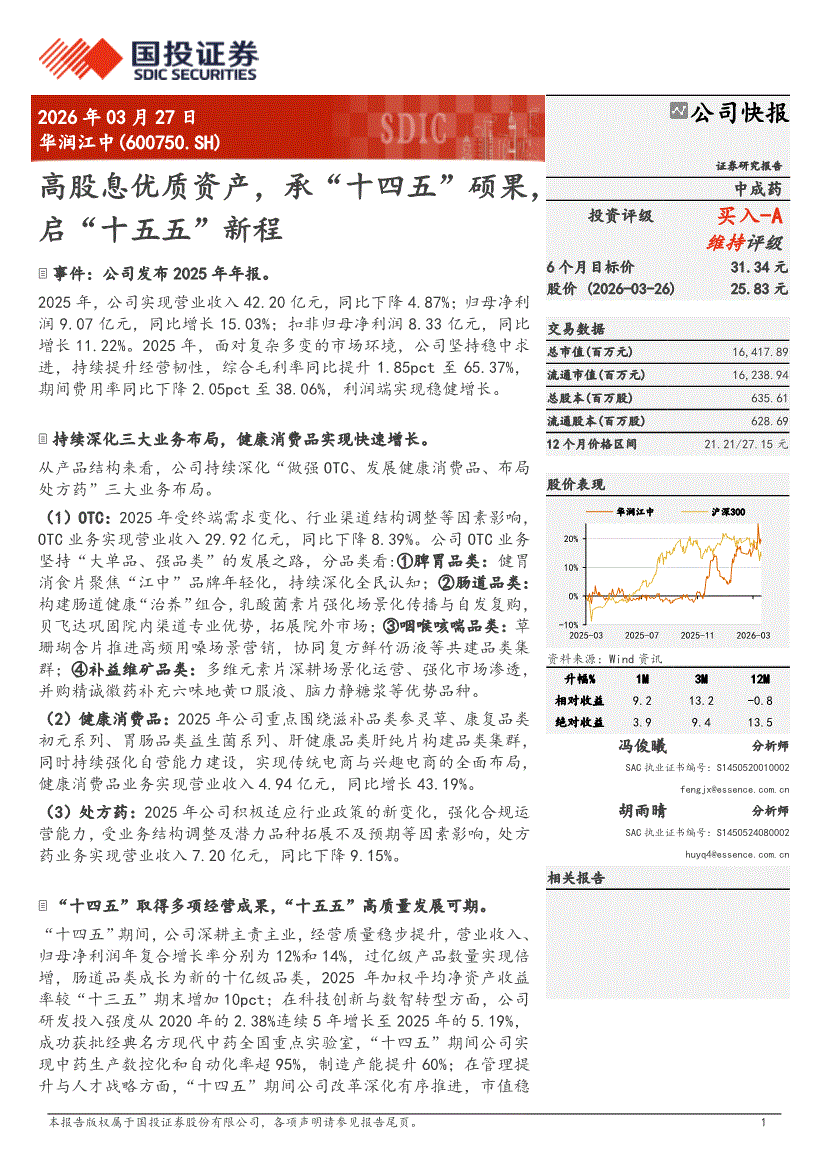 华润江中:国投证券-华润江中-600750-高股息优质资产,承“十四五”硕果,启“十五五”新程-260327