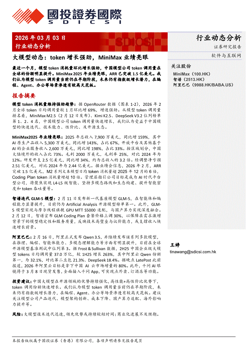 软件与互联网行业:国投证券国际-软件与互联网行业大模型动态:token增长强劲,MiniMax业绩亮眼-260303