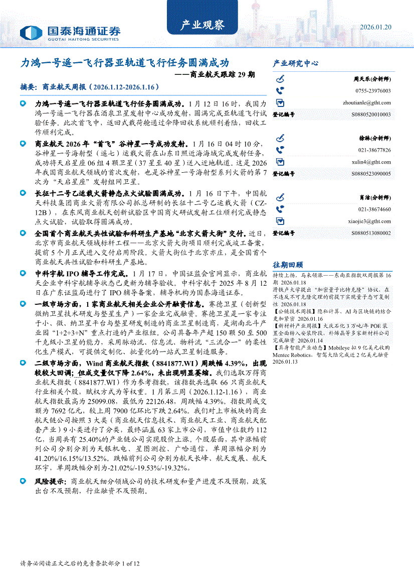 国泰海通证券-产业观察:商业航天跟踪29期,力鸿一号遥一飞行器亚轨道飞行任务圆满成功-260120