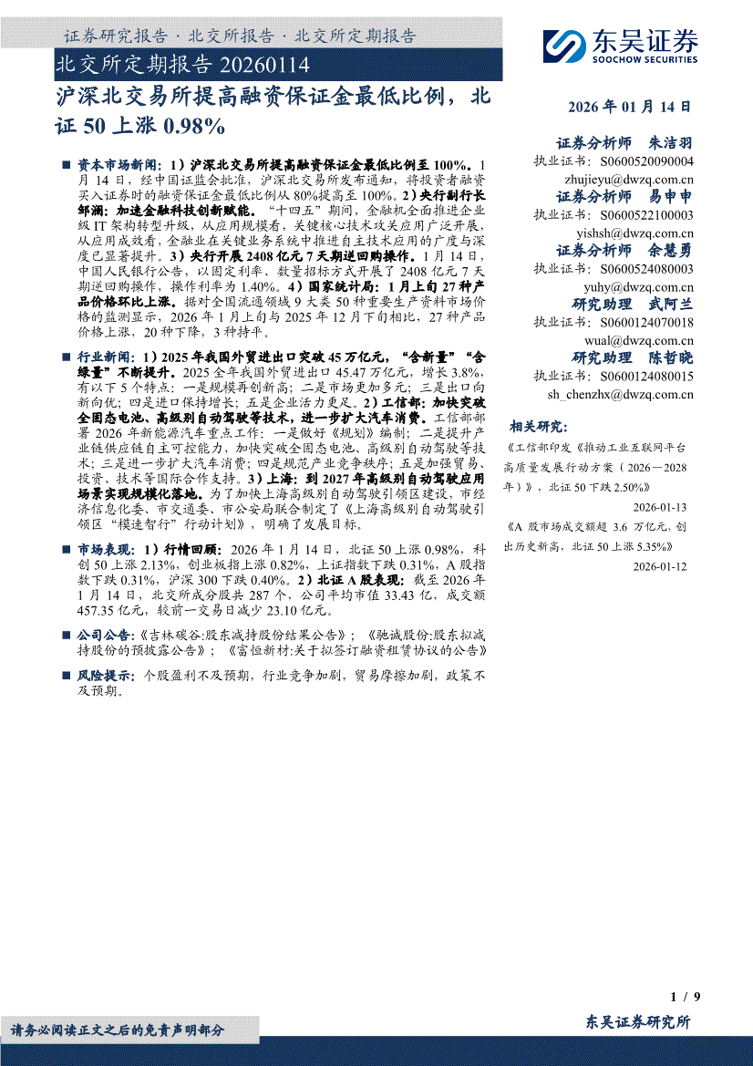 东吴证券-北交所定期报告:沪深北交易所提高融资保证金最低比例,北证50上涨0.98%-260114