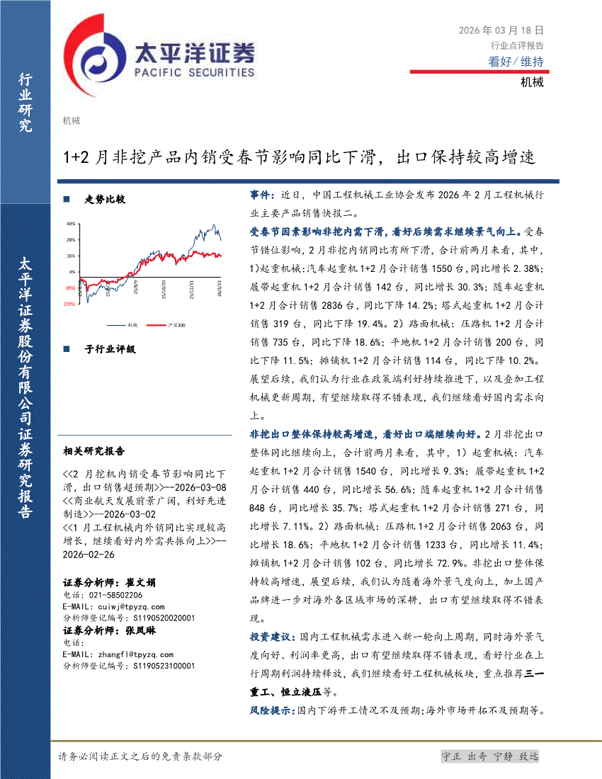 机械行业:太平洋证券-机械行业点评报告:1+2月非挖产品内销受春节影响同比下滑,出口保持较高增速-260318