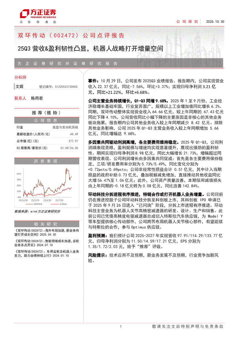 双环传动:方正证券-双环传动-002472-公司点评报告:25Q3营收&盈利韧性凸显,机器人战略打开增量空间-251030
