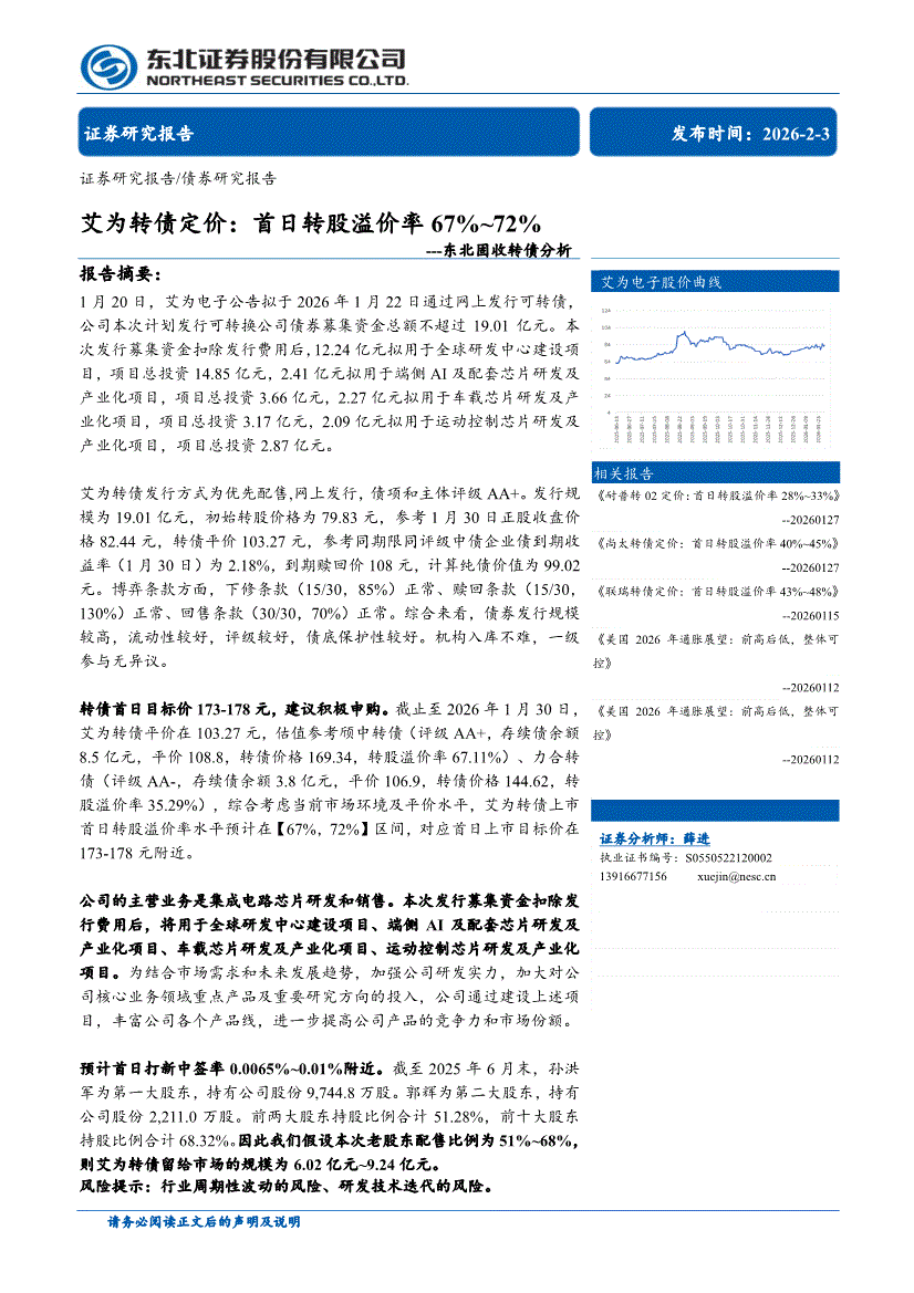 东北证券-固收转债分析:艾为转债定价,首日转股溢价率67%~72%-260203