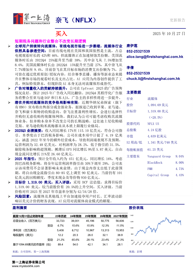 奈飞:第一上海-奈飞-NFLX.US-短期税务问题和行业整合不改变长期逻辑-251027