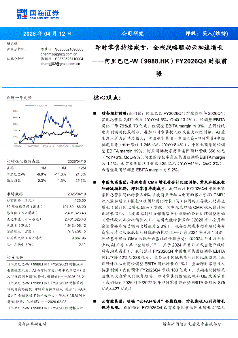 阿里巴巴~W:国海证券-阿里巴巴~W-9988.HK-FY2026Q4财报前瞻:即时零售持续减亏,全栈战略驱动云加速增长-260412