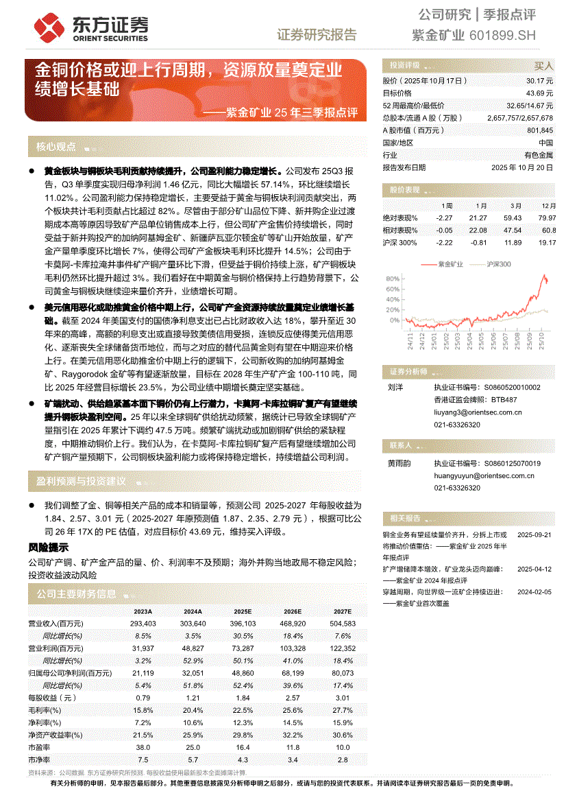 紫金矿业:东方证券-紫金矿业-601899-25年三季报点评:金铜价格或迎上行周期,资源放量奠定业绩增长基础-251020