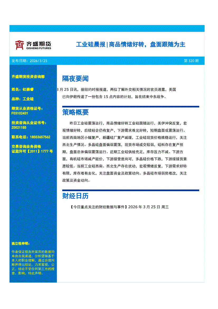 齐盛期货-工业硅晨报:商品情绪好转,盘面跟随为主-260325