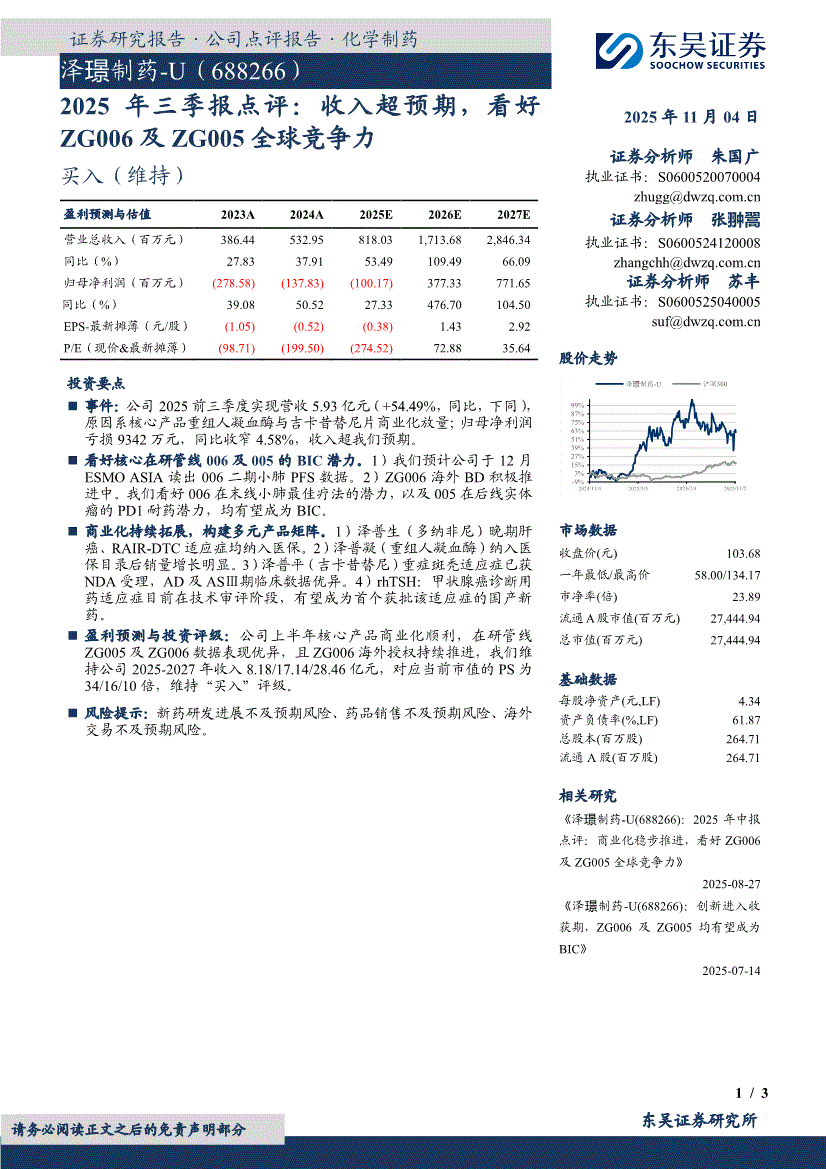泽璟制药:东吴证券-泽璟制药-688266-2025年三季报点评:收入超预期,看好ZG006及ZG005全球竞争力-251104