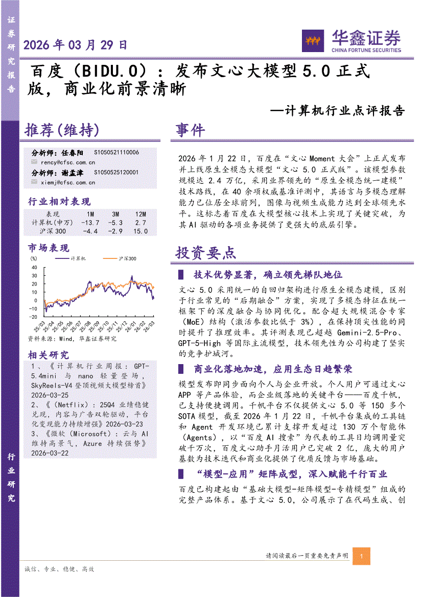 计算机行业:华鑫证券-计算机行业点评报告:百度(BIDU.O),发布文心大模型5.0正式版,商业化前景清晰-260329
