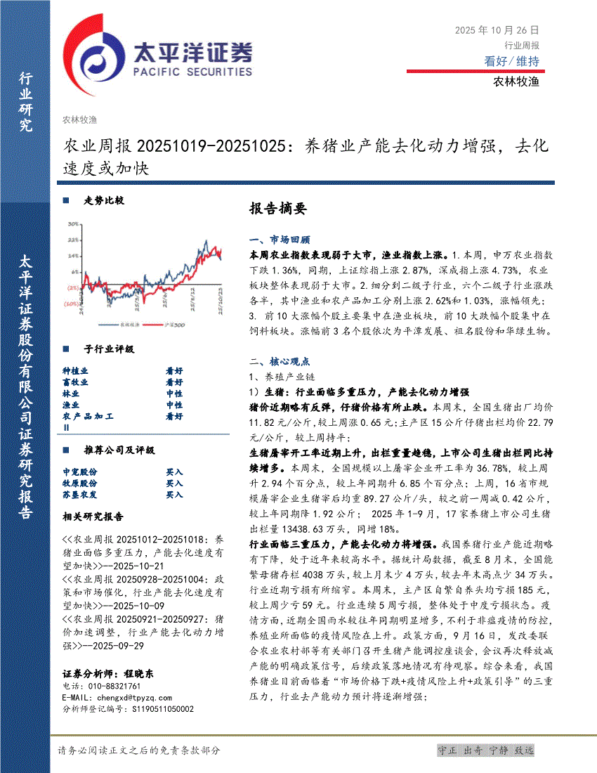 农业:太平洋证券-农业周报20251019~20251025:养猪业产能去化动力增强,去化速度或加快-251026