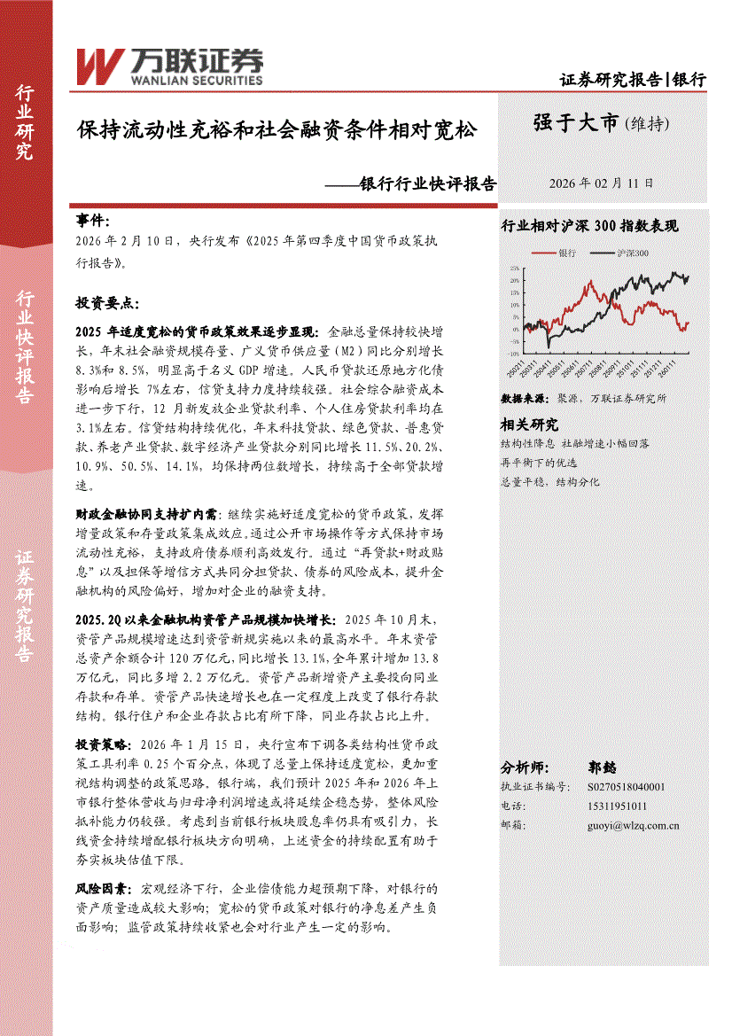 银行业:万联证券-银行行业快评报告:保持流动性充裕和社会融资条件相对宽松-260211