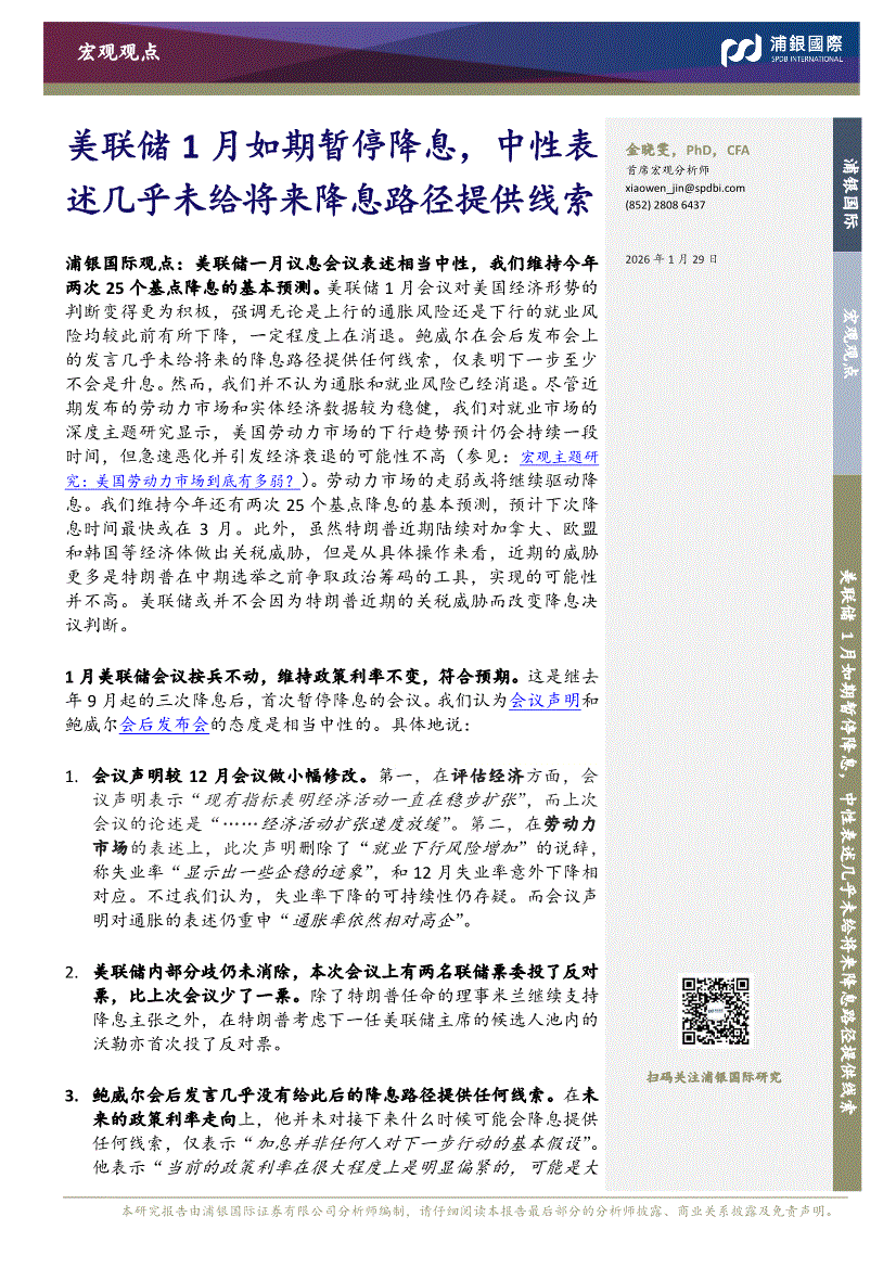浦银国际-美联储1月如期暂停降息,中性表述几乎未给将来降息路径提供线索-260129