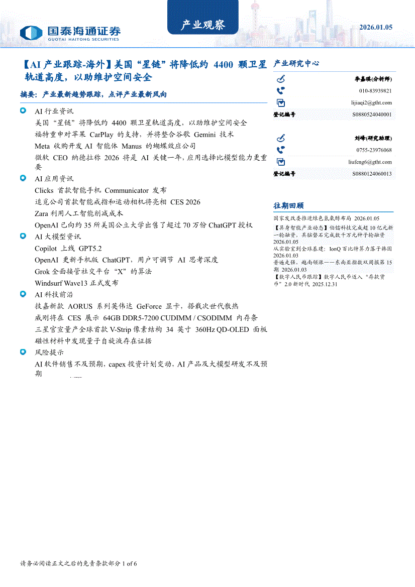 国泰海通证券-产业观察:【AI产业跟踪~海外】美国“星链”将降低约4400颗卫星轨道高度,以助维护空间安全-260105
