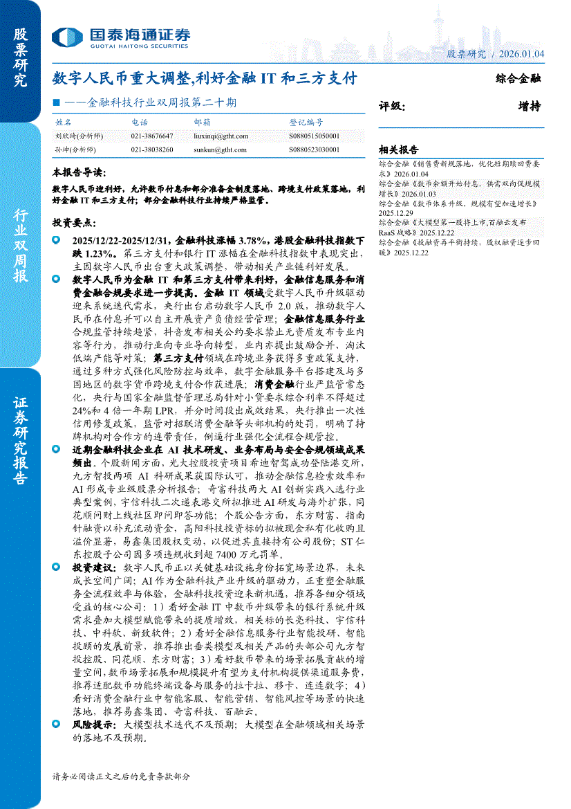 金融科技行业:国泰海通证券-金融科技行业双周报第二十期:数字人民币重大调整,利好金融IT和三方支付-260104