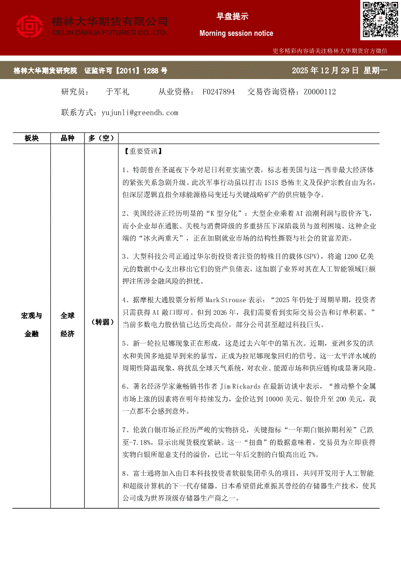格林大华期货-早盘提示:全球经济-251229