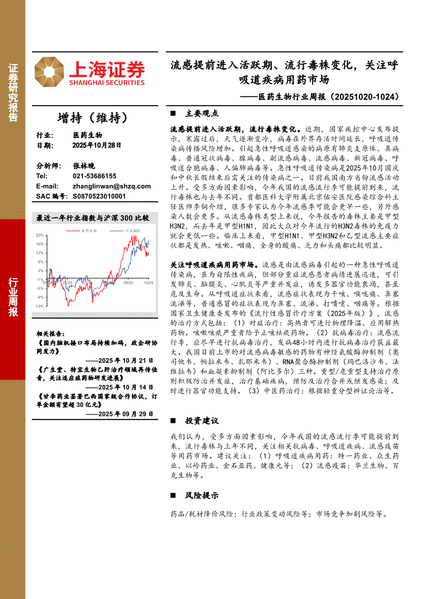 医药生物行业:上海证券-医药生物行业周报:流感提前进入活跃期、流行毒株变化,关注呼吸道疾病用药市场-251028