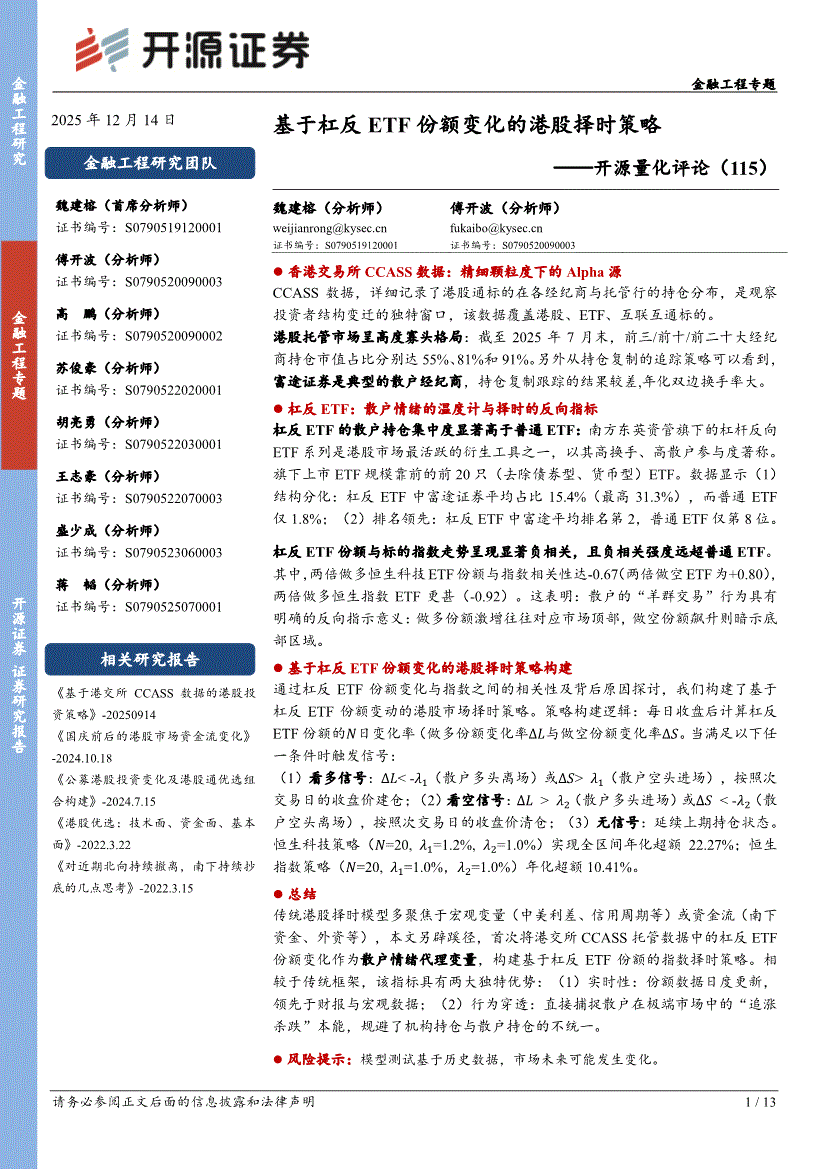 开源证券-开源量化评论(115):基于杠反ETF份额变化的港股择时策略-251214