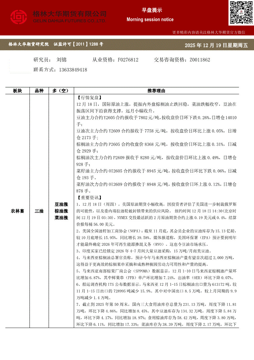 格林大华期货-一周简评:油脂延续分化,棕榈油最弱,豆油震荡,菜籽油最强,蛋白调整空间有限-251122