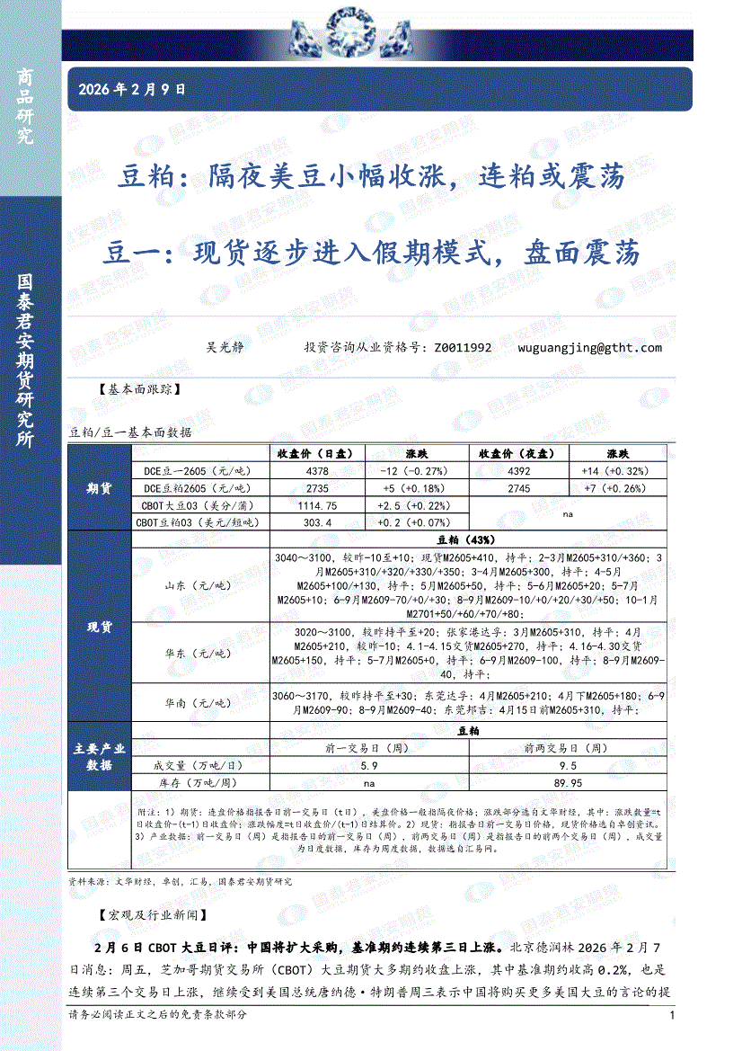 国泰君安期货-豆粕:盘面震荡,豆一,盘面震荡-260202