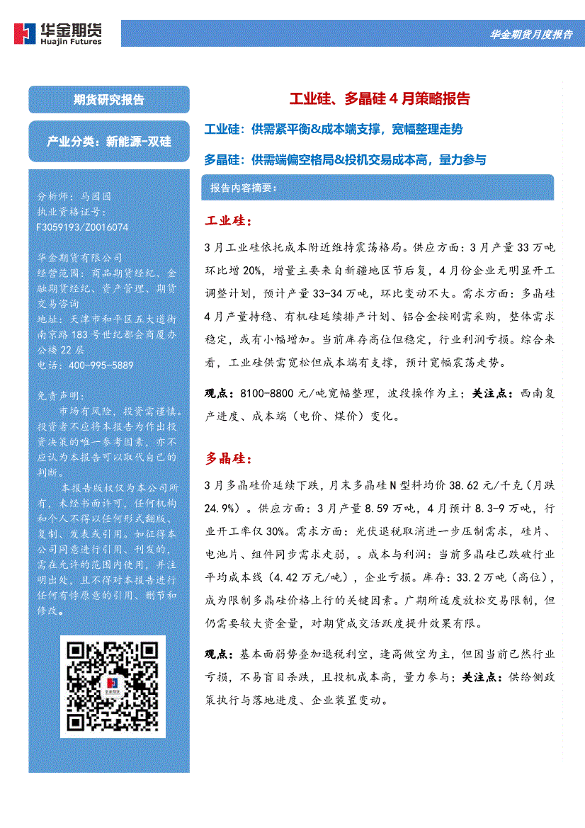 华金期货-工业硅、多晶硅4月策略报告:工业硅,供需紧平衡&成本端支撑,宽幅整理走势,多晶硅,供需端偏空格局&投机交易成本高,量力参与-260402