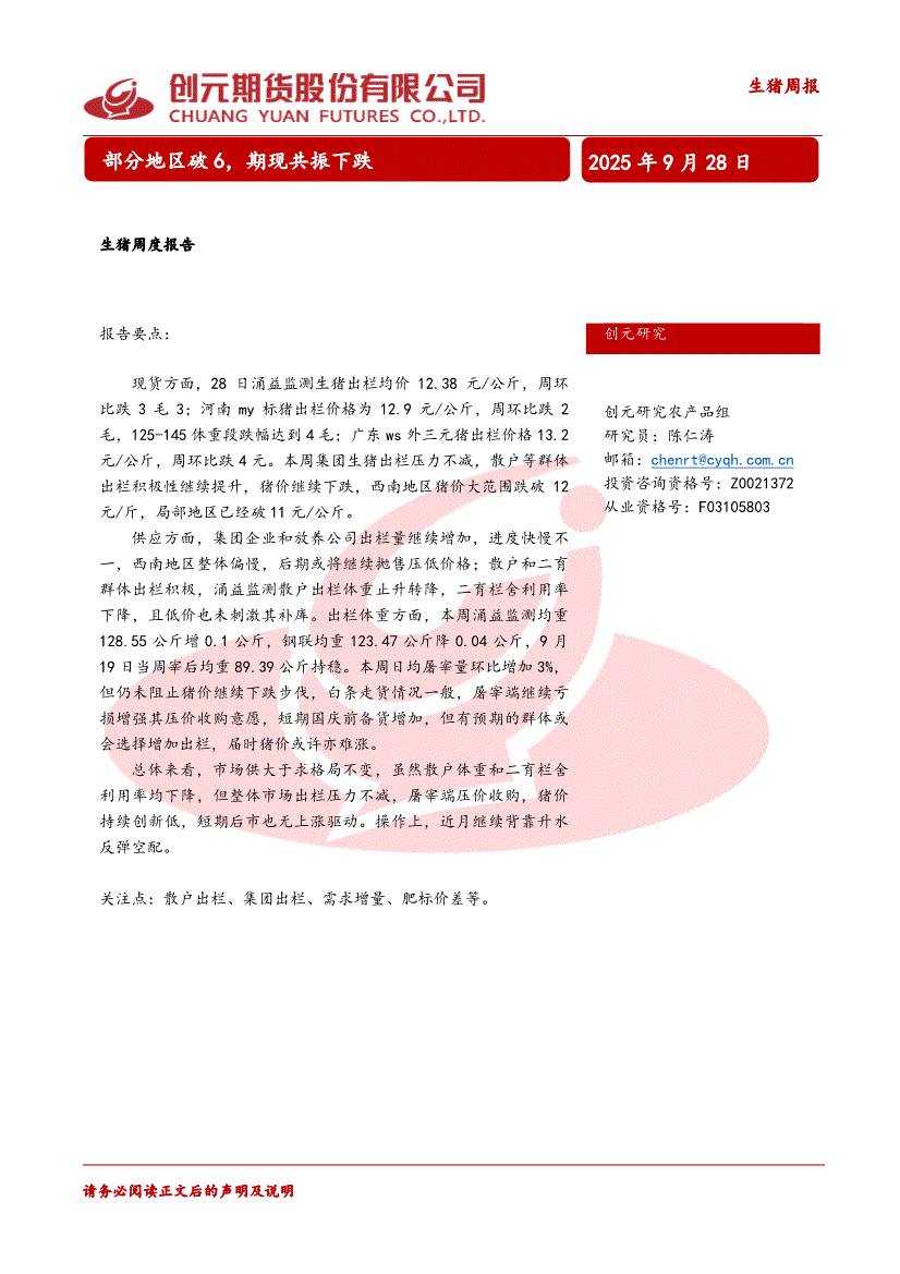 创元期货-生猪周度报告:部分地区破6,期现共振下跌-250928